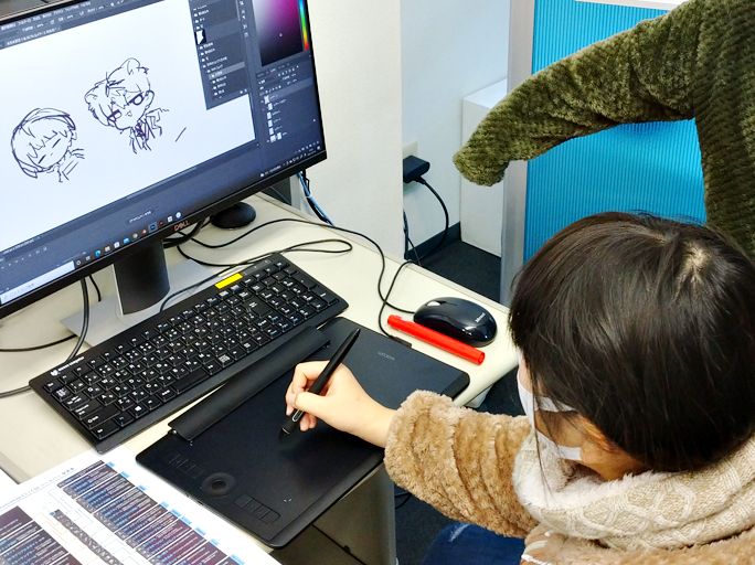 体験中はパソコンやペンタブレットなどを1人1台貸出して体験を行います。もちろん必要なソフトもすべてインストール済。買い揃えていただく必要はありません。